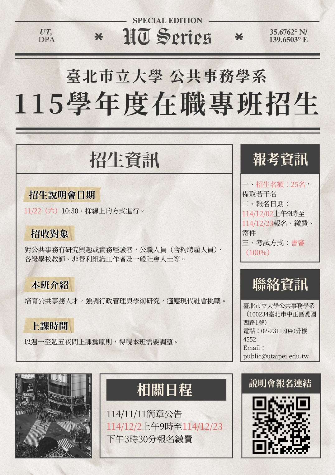 為利貴機關人員了解招生細節及課程特色,特舉辦招生說 明會,敬邀有興趣之公務人員上線參與: