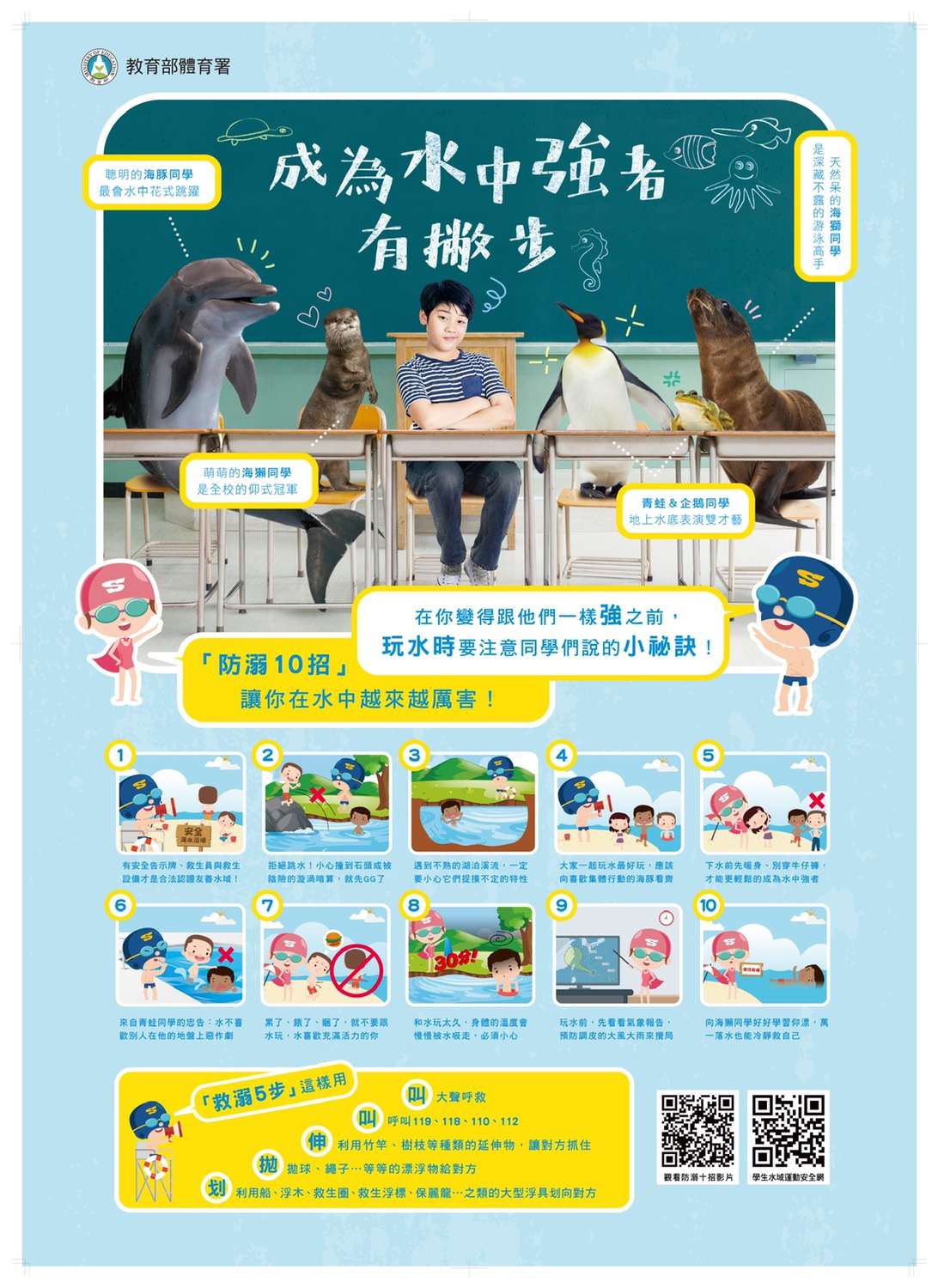 (三)教育部體育署提出「救溺五步、防溺十招」、「溪河流自救救人篇」、「常見危險水域特性」,請各校務必加強利用各種管道向學生說明宣導