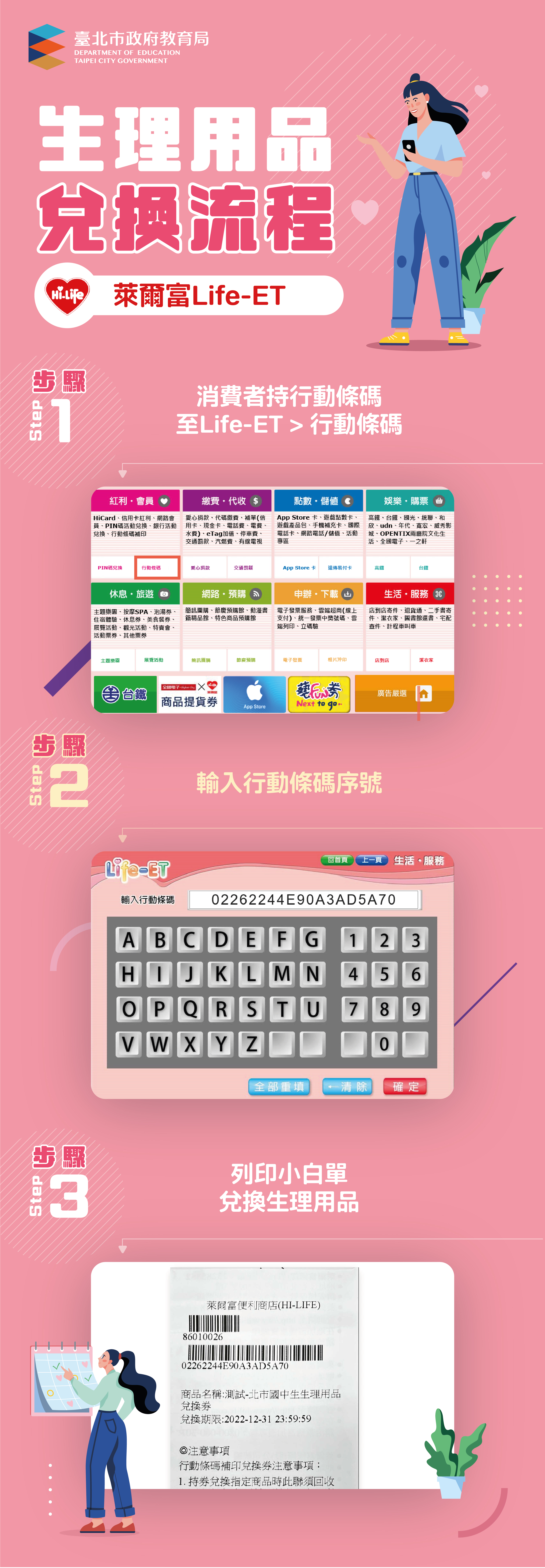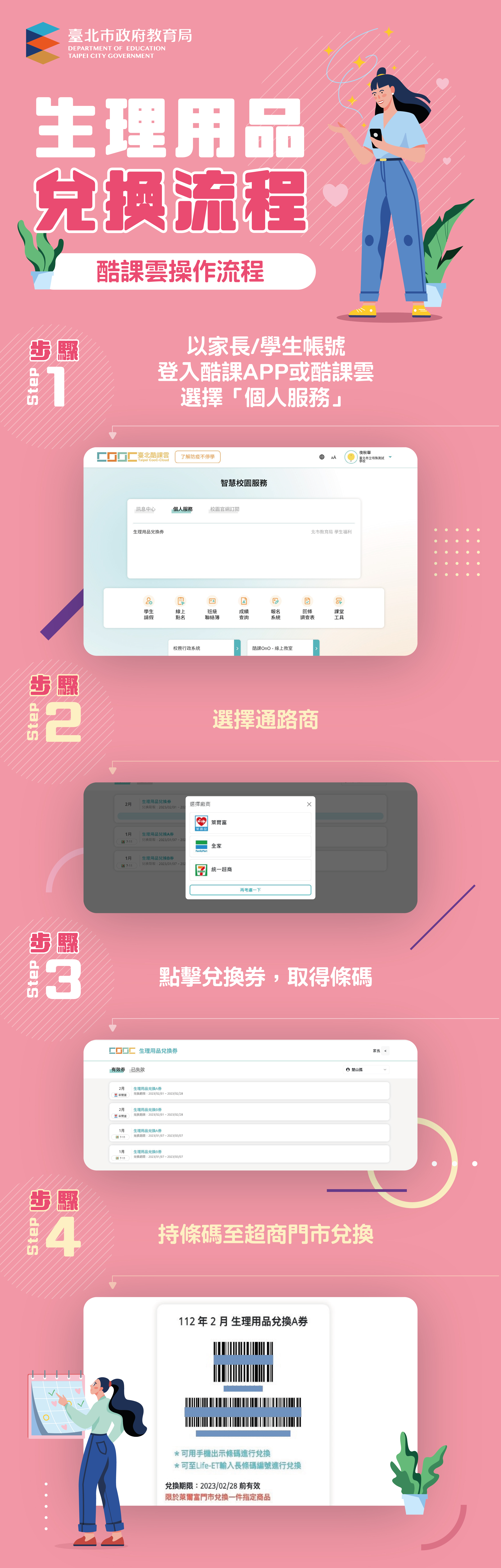 三、使用方式:每月2張兌換券,每張100元,每券可兌換指定生理用品一項,不接受補差額或要求找零,亦無法與門市其他促銷優惠同時使用。