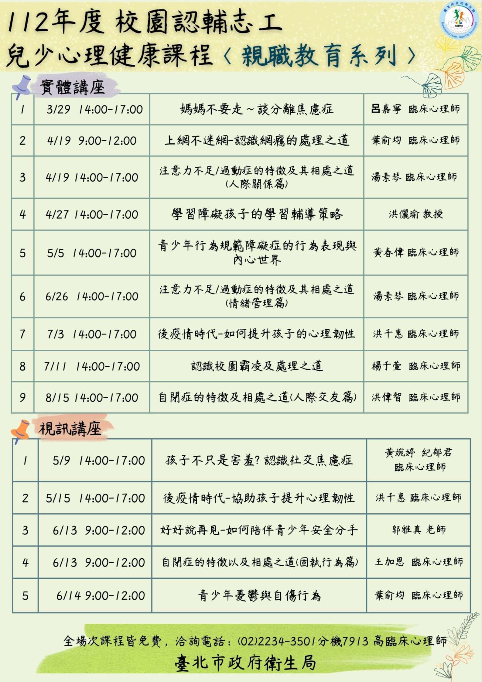 二、衛生局為增進校園認輔志工兒少相關心理衛生知能,以及家長照顧特殊兒少之親職能力,爰辦理旨揭課程。請貴校