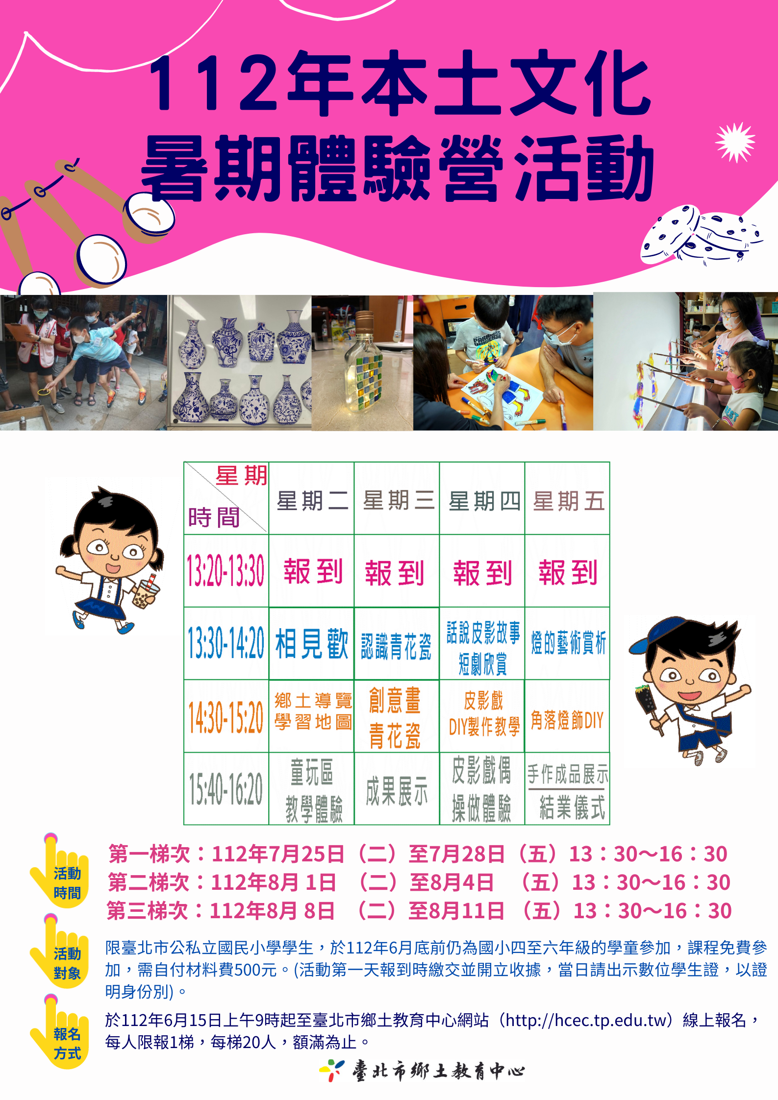 限臺北市公私立國民小學學生,於112年6月底前仍為國小四至六年級的學童參加,每梯限量20名,課程免費參加,需自付材料費500元。(活動第一天報到時繳交由劇團查收並開立收據,當日請出示數位學生證,以證明身份別)。