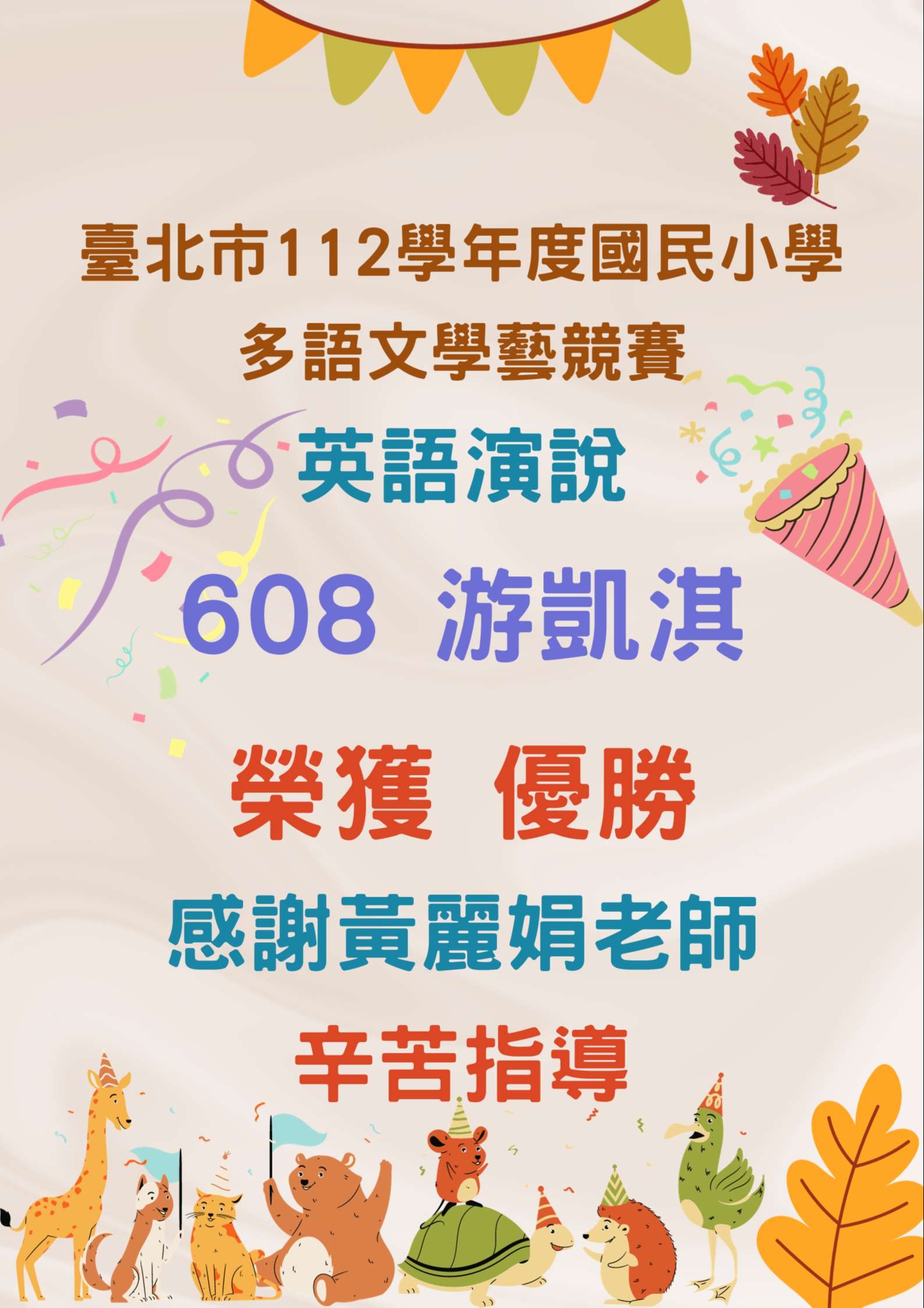 恭喜六年8班游凱淇榮獲優勝!
