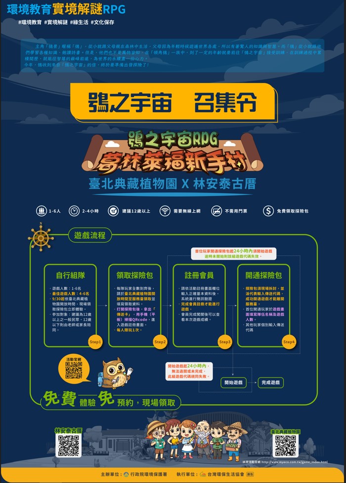 2.另實境解謎遊戲需在臺北典藏植物園開放時間(9:00~17:00,星期一休園)至該園入口處服務臺現場領取實境解謎探險包即可免費體驗,領取後請於當天進行註冊,開通探險包,並於24小時內進行體驗。