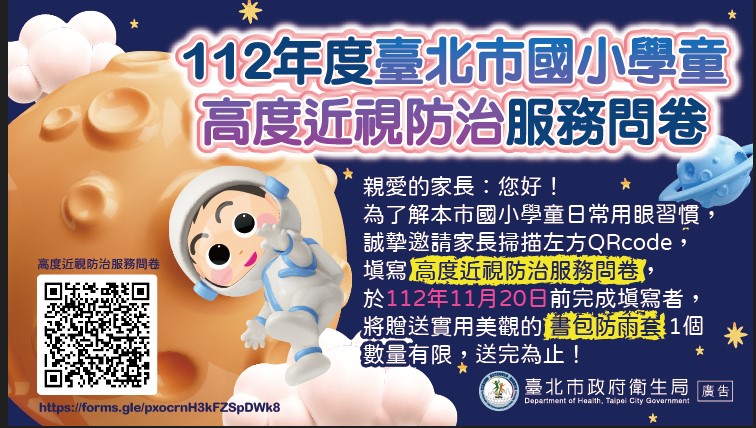 3.提早於112年11月20日前完成填寫問卷者(期限至11月30日止),衛生局將透過學校致贈「書包反光防雨套」1個,數量有限,請家長踴躍填寫。