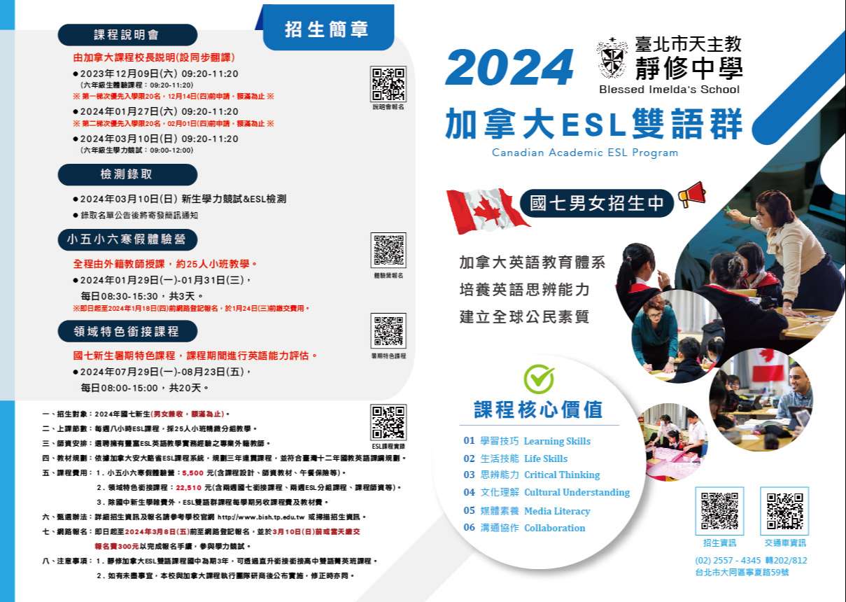 一、為使 貴校家長與學生充分了解本校國中部加拿大雙語課程、全人菁英課程之入學資訊,舉辦招生說明會,如下所示: