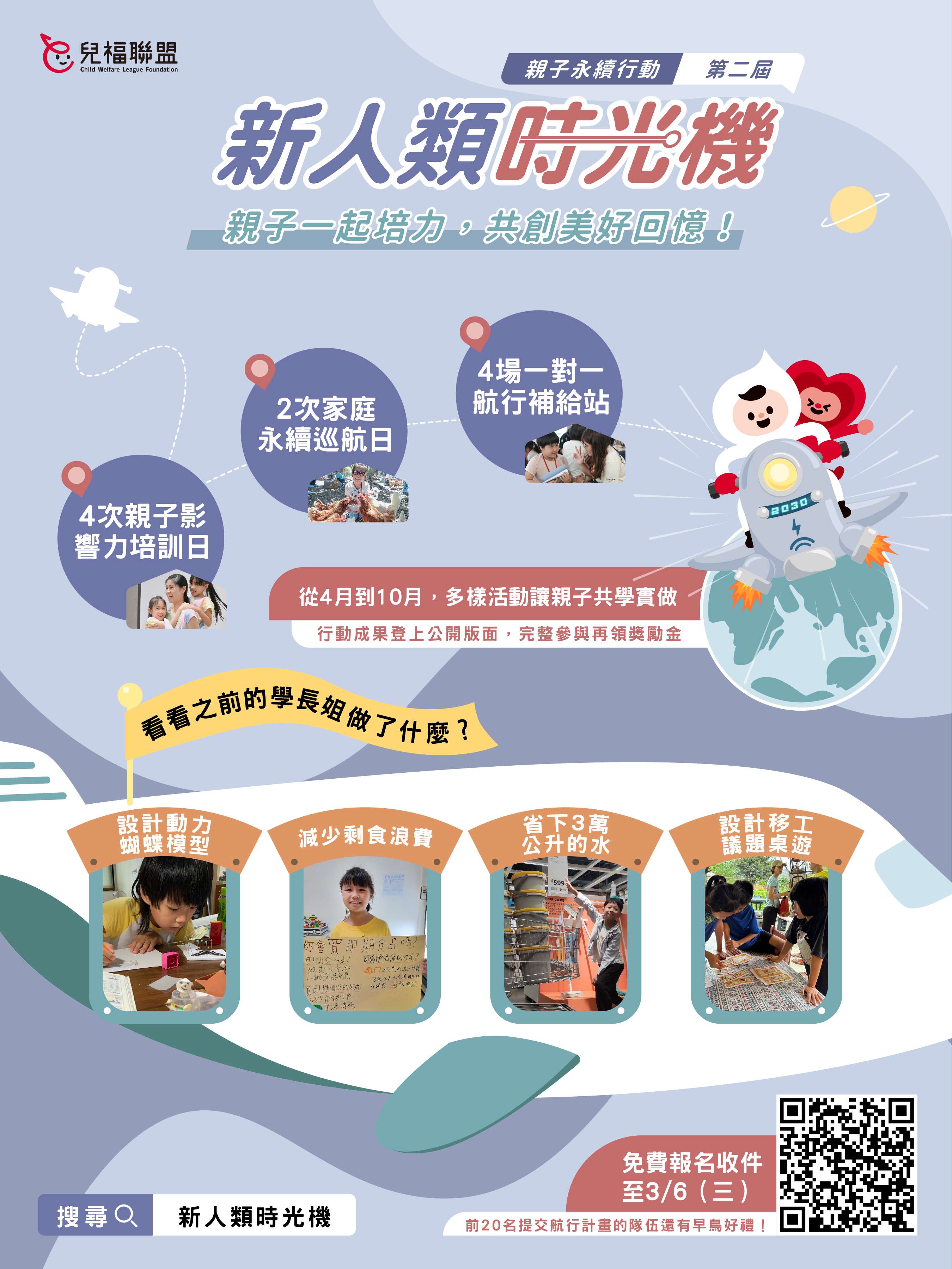 說明:《新人類時光機》是以家庭為單位的永續行動培力計畫,我們希望透過親子共學培養孩子的觀察、同理能力,並讓親子在過程中一同練習關懷世界,接觸更多元的永續發展