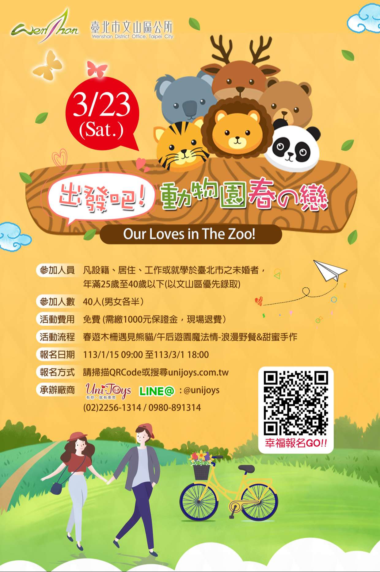 一、旨揭活動訂於113年3月23日(星期六)下午13時至17時假臺北市立動物園(臺北市文山區新光路二段30號)舉辦, 線上報名時間自113年1月15日(星期一)起至113年3月1日(星期五)或額滿為止。