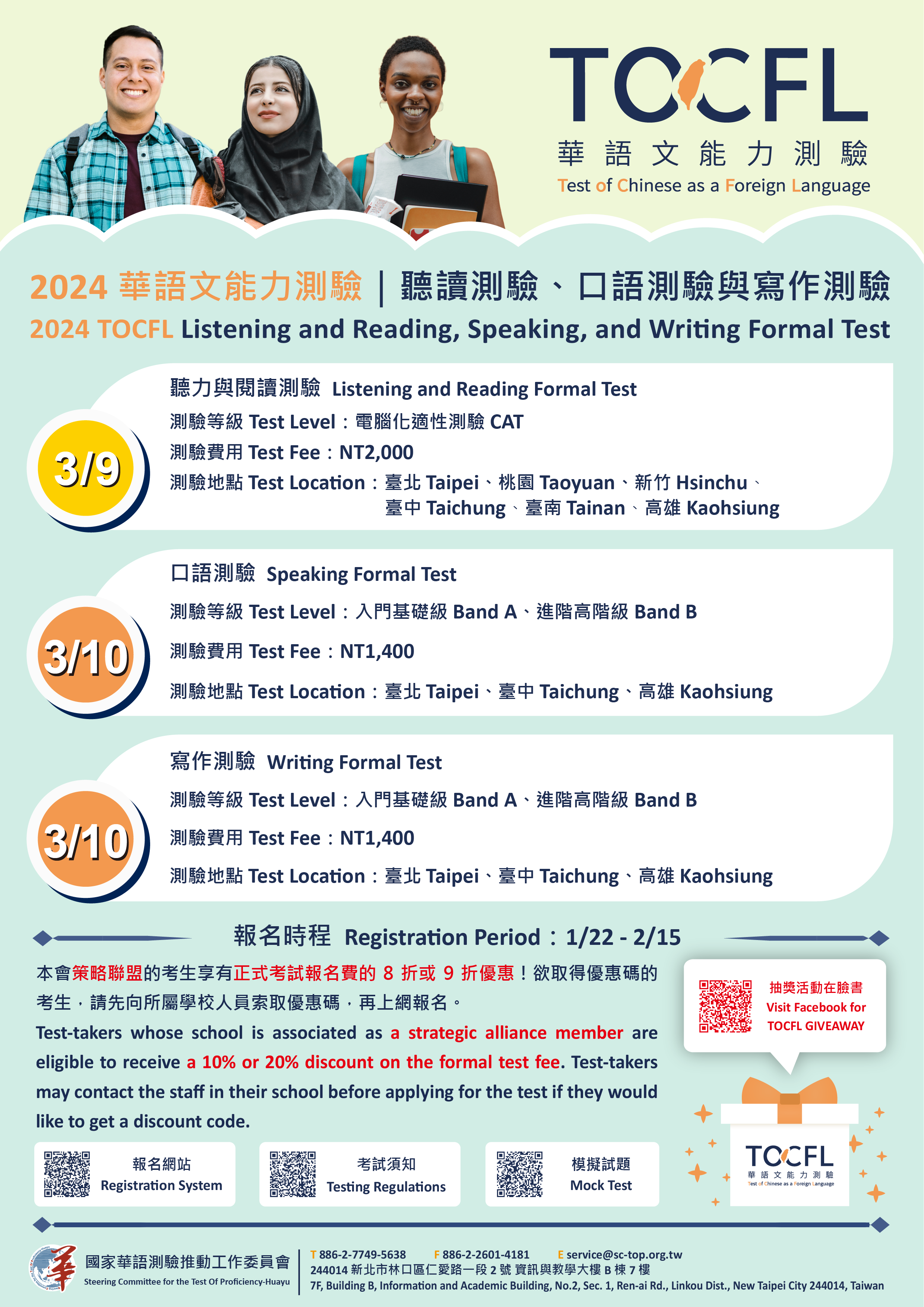四、抽獎活動:凡報考任一測驗並完成繳費者,可參加華測FB 粉絲專頁抽獎活動。詳情請見粉絲專頁貼文: https://www.facebook.com/SCTOP.TOCFL。