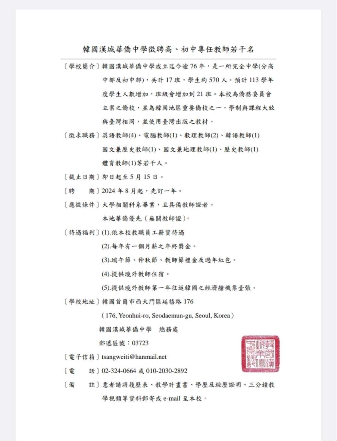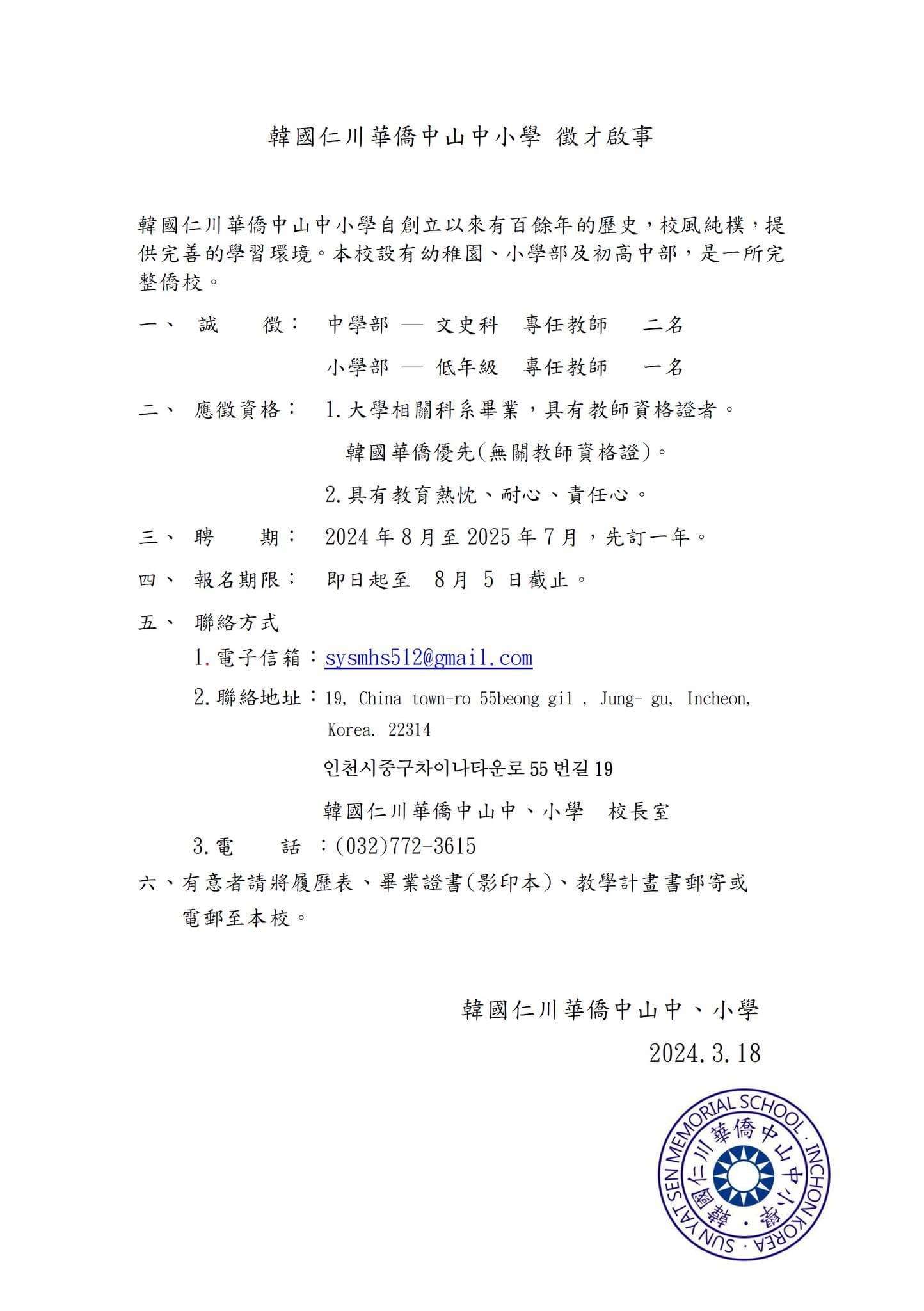 二、旨揭僑校擬招聘教師數名,其條件及待遇等資料詳徵才資訊(如附件);有意應徵者請將初審資料備齊後,逕電郵、電洽或郵寄至該校辦理。