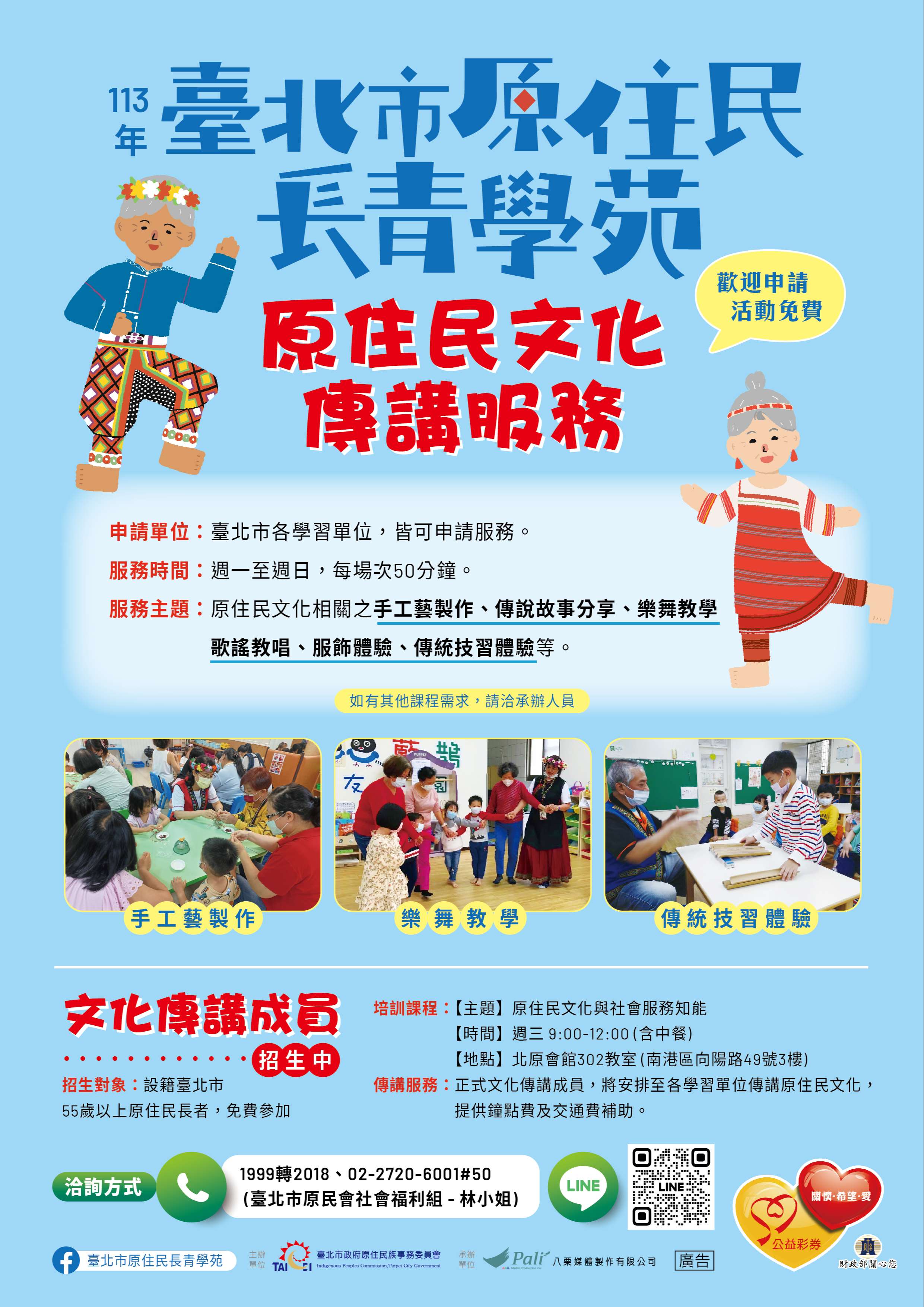 一、臺北市政府原住民族事務委員會現已培訓多名原住民長者至社區、學校提供社會服務,服務內容包含原住民傳統神話故事、原住民手工藝製作教學、原住民樂舞教唱、 傳統技藝學習體驗等各原住民族相關傳統文化內容教唱與學習等。