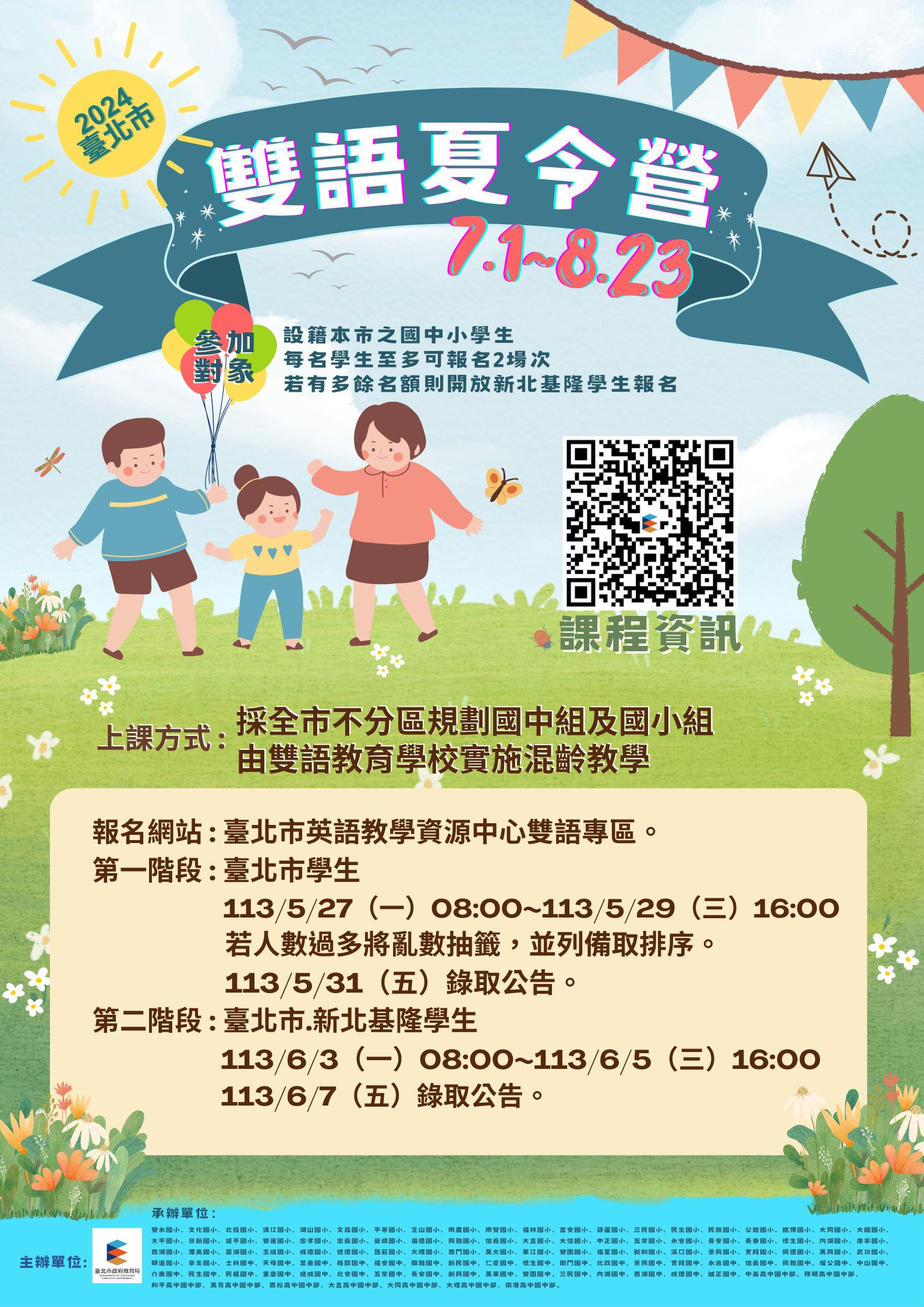 於113年5月27日(星期一)上午8時起在臺北市英語教學資源中心雙語專區(https://ecamp.tp.edu. tw /bilingual/index.php)開放網路線上報名。 )臺北市學生報名時間為113年5月27日(星期一)上 午8時至113年5月29日(星期三)下午4時止,錄取名單將於113年 5月31日(星期五)公告。