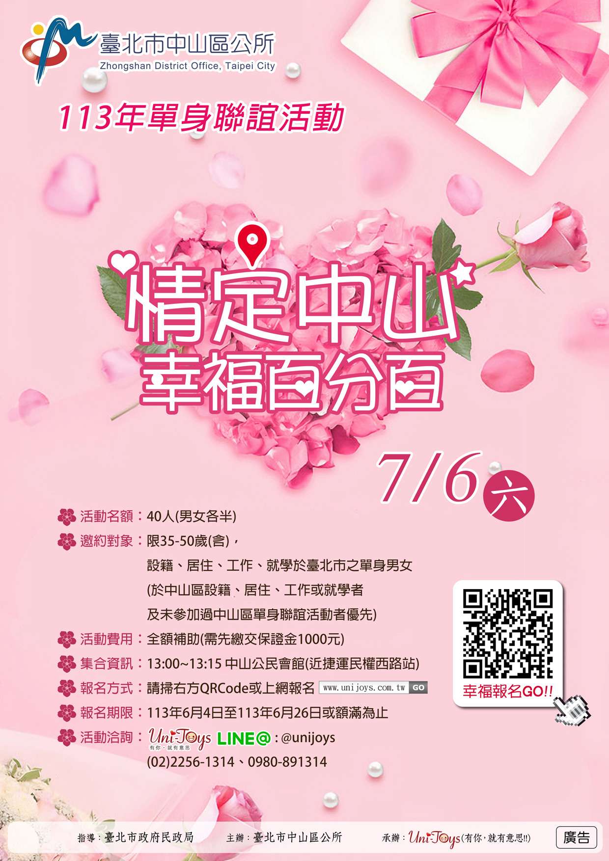 二、請貴單位惠予協助於所屬網站宣傳,文稿內容如下:「臺 北市中山區公所『情定中山 幸福百分百』單身聯誼活動, 將於113年7月6日(星期六)13時至18時假臺北市中山公民 會館舉辦,活動名額為男、女各20人,共40人,歡迎年齡 35歲以上至50歲設籍於本市或於本市居住、工作、就學之 單身者踴躍報名參加(於中山區設籍、居住、工作或就學者及未參加過中山區單身聯誼活動者優先),活動詳情請 參閱本所官網(https://zsdo.gov.taipei/)或電洽(02) 25031369分機593鍾小姐。」