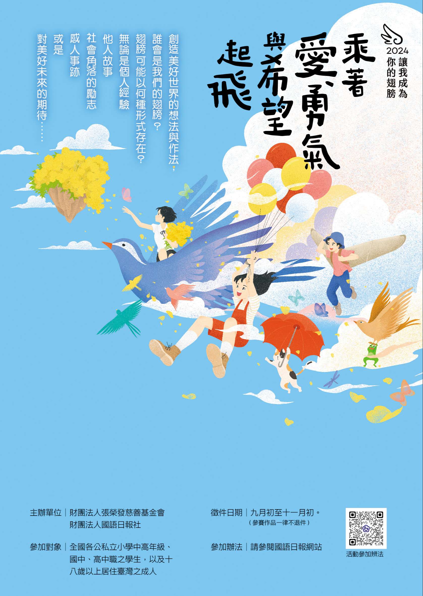 一、為了鼓勵正面助人的精神,強調社會連結與人際支持的重要,本社與張榮發慈善基金會合辦「2024讓我成為你的翅膀──乘著愛、勇氣與希望起飛」徵件活動。