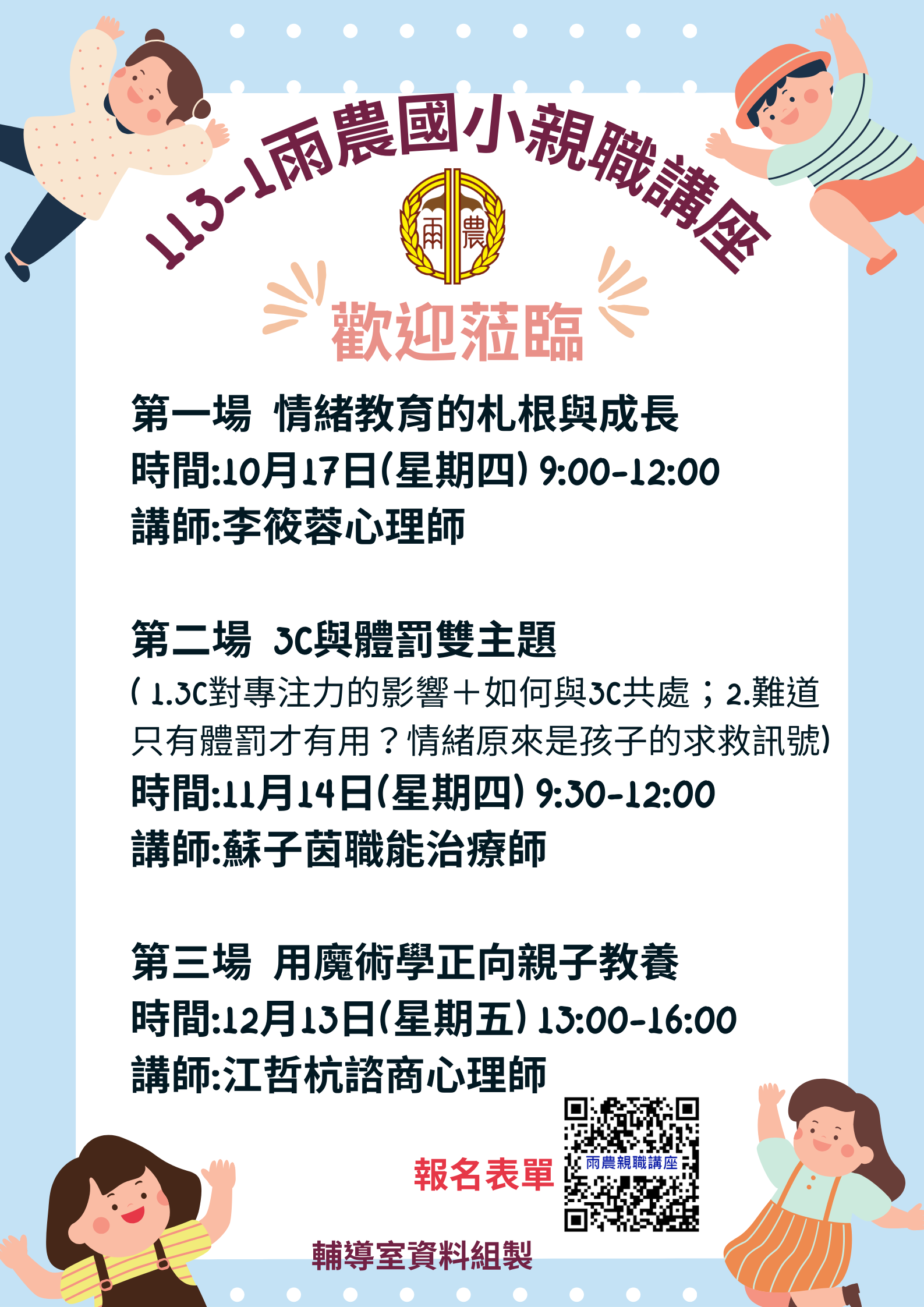 一、雨農國小辦理三場親職講座課程,結合愛的存款簿學習集點活動給予時數,地點在本校活動中心一樓視聽中心。講座課程內容如下: