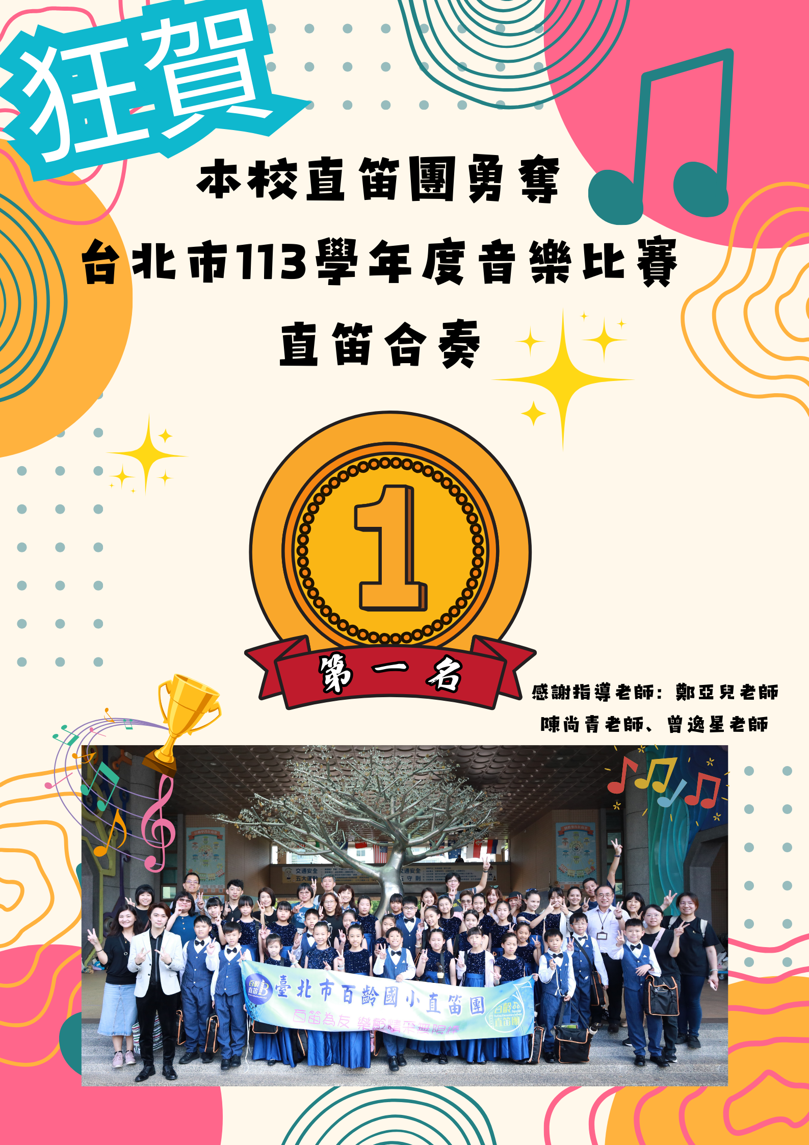 狂賀!!本校直笛團參加113學年度台北市學生音樂比賽榮獲北區優等第一名。