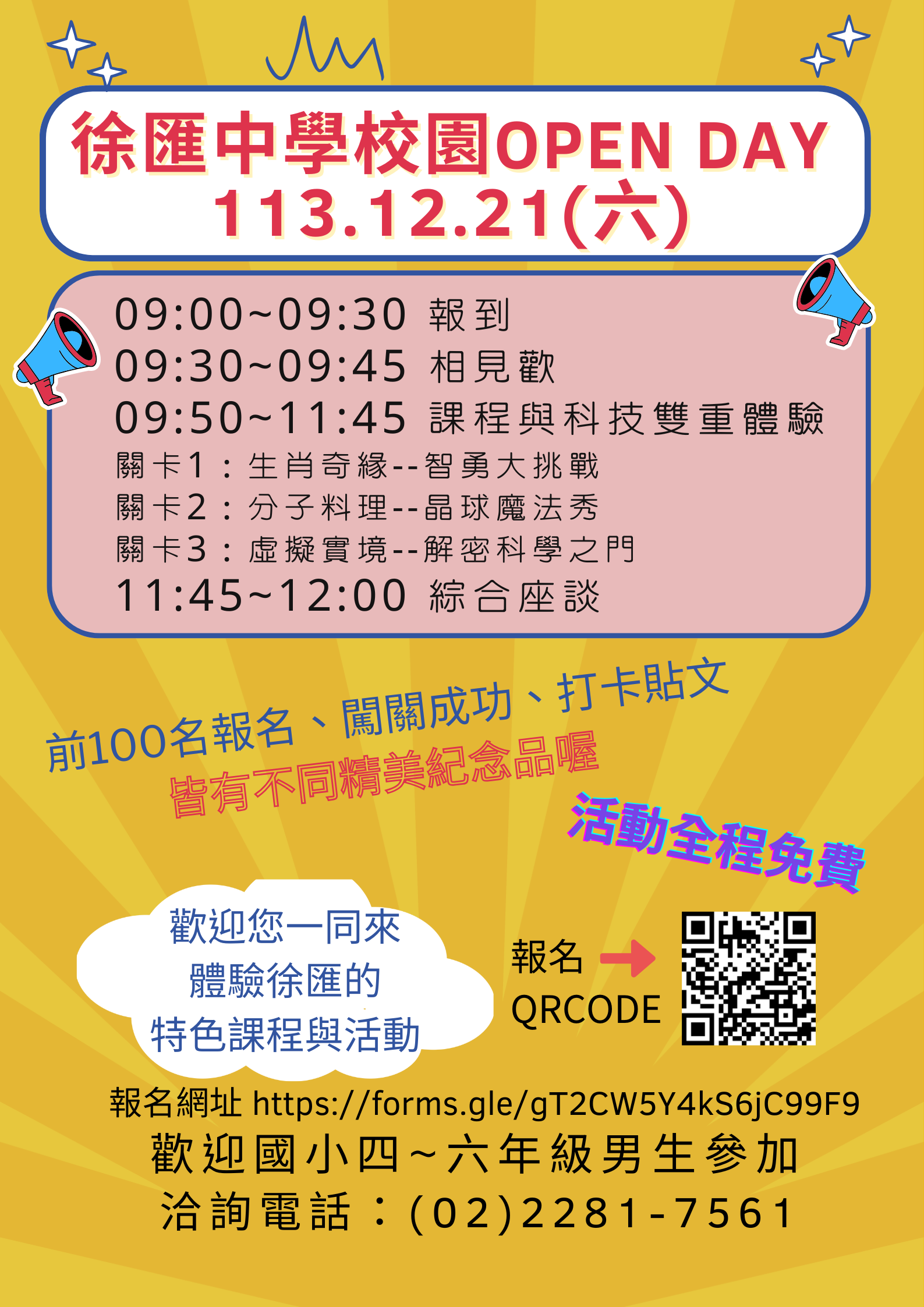 一、本校著重培育學生具備自覺、才智、愛心、豪氣四大能力,歡迎國小學生參加本校辦理之「徐匯OPEN DAY」,親自體驗本校特色課程及特色活動。