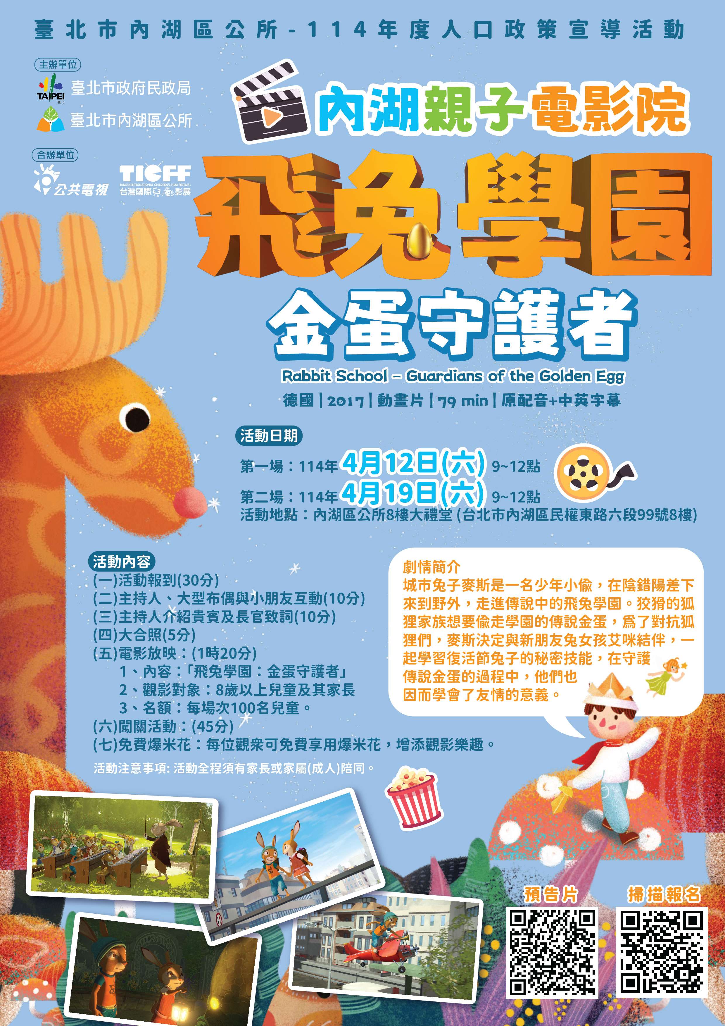 內湖親子電影院將於114年4月12日及4月19日舉辦,邀請親子共同欣賞台灣國際兒童影展影片《飛兔學園:金蛋守護者》,地點為本所8樓大禮堂(臺北市內湖區民權東路6段99號8樓)。每場次限100組親子參加,活動