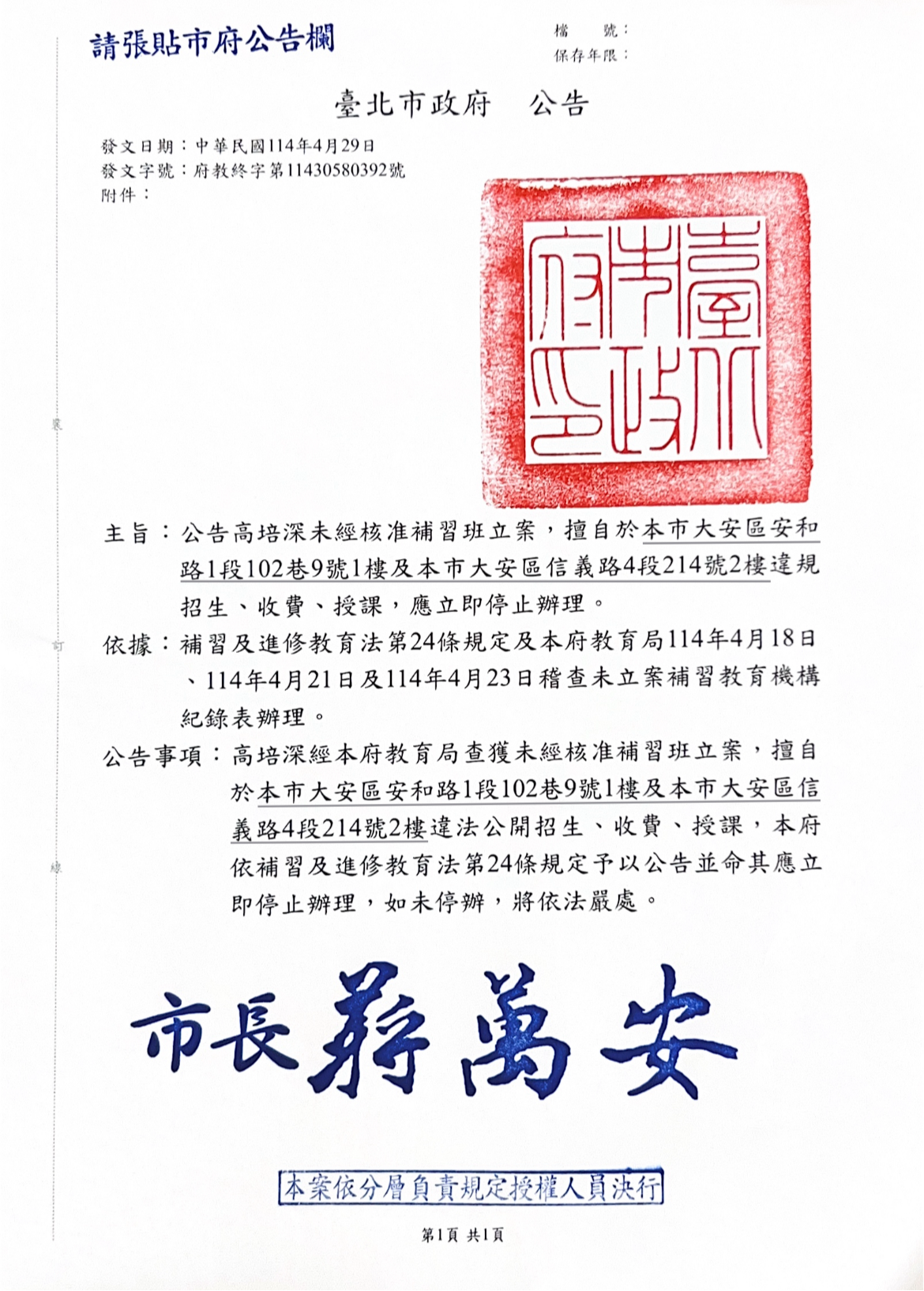 二、高培深經本局查獲未經核准補習班立案,擅自於本市大安 區安和路1段102巷9號1樓及本市大安區信義路4段214號2樓 違法招生收費、授課,經本局依補習及進修教育法第24條 規定裁處及公告,並命其立即停止辦理。