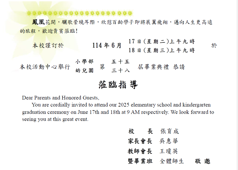 本校謹訂於中華民國114年6月17日(星期二)上午九時 於本校活動中心舉行 第 55 屆畢業典禮。