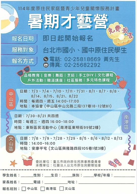 臺北市政府原住民族事務委員會委託社團法人台北市原住民關懷協會辦理「114年原住民家庭暨青少年兒童關懷服務計畫—暑期才藝營」報名宣傳單,惠請各校發送或轉知所轄原住民家戶踴躍報名參加。