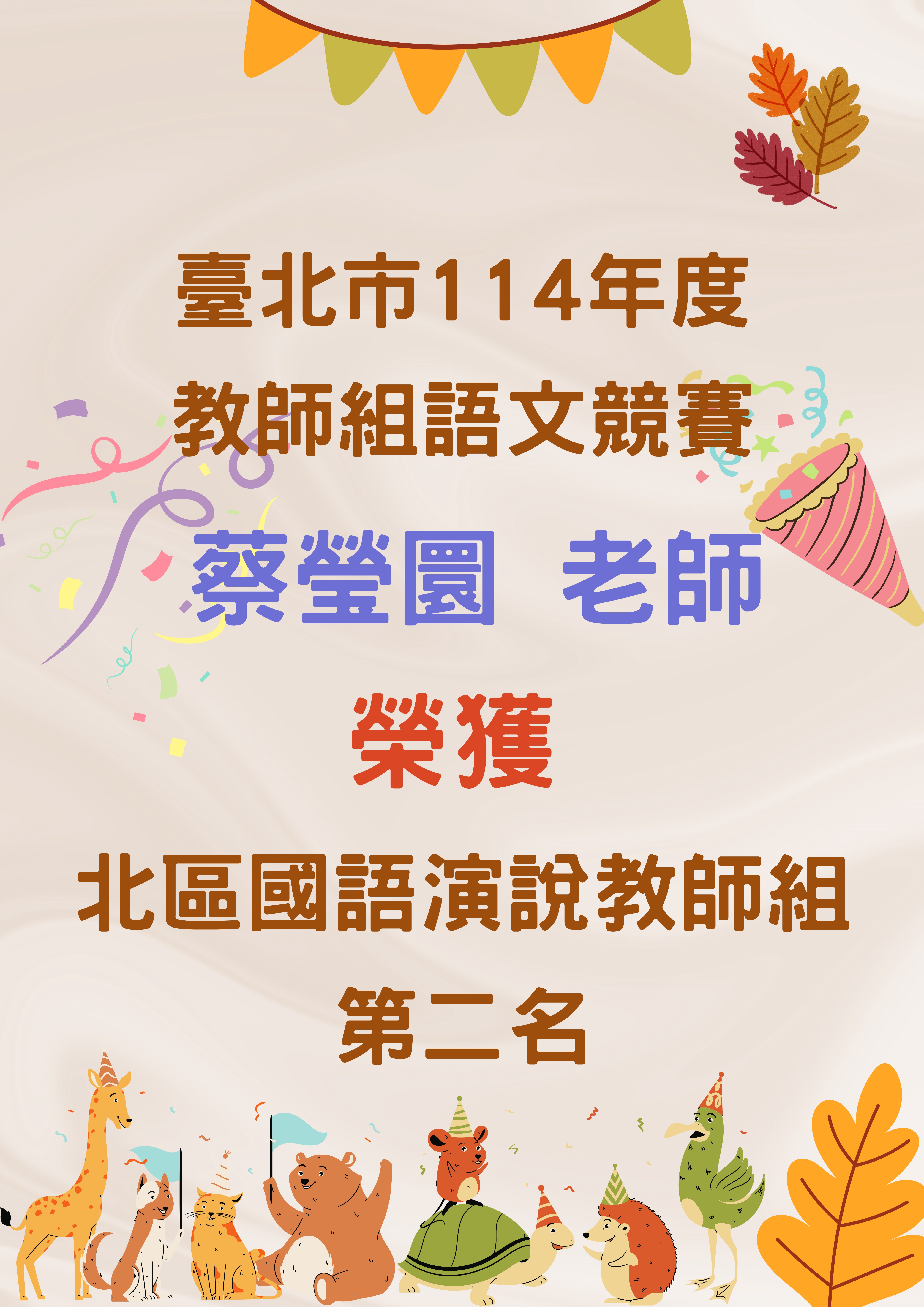 恭喜蔡瑩圜老師 榮獲臺北市114年度語文競賽 北區國語演說教師組 第二名!