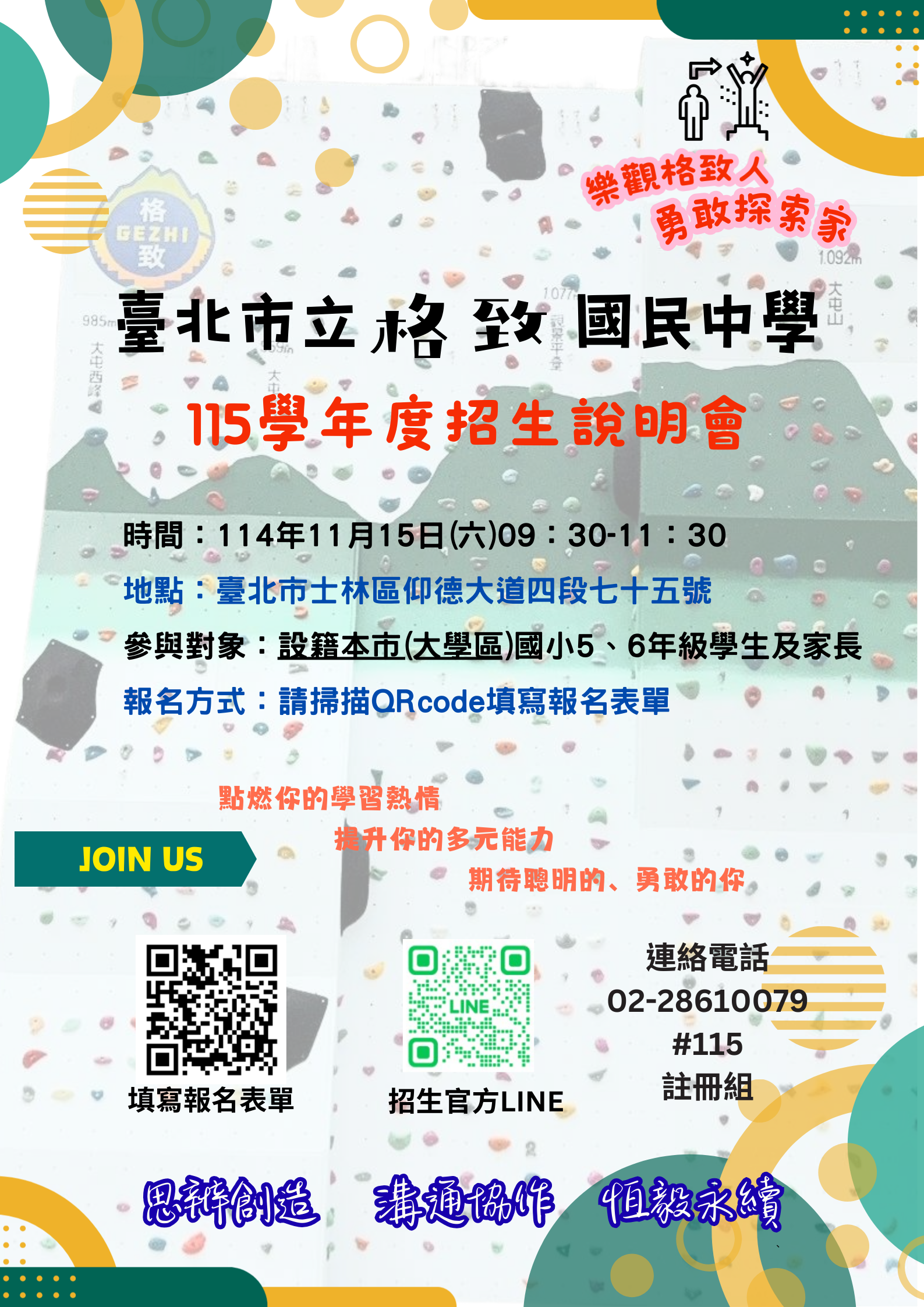 二、本校為大學區學校,凡設籍臺北市之新生皆可就讀。為使更多學生及家長了解本校辦學資訊,特辦理旨揭說明會,敬請轉知貴校五、六年級之學生,並協助公告說明會訊
