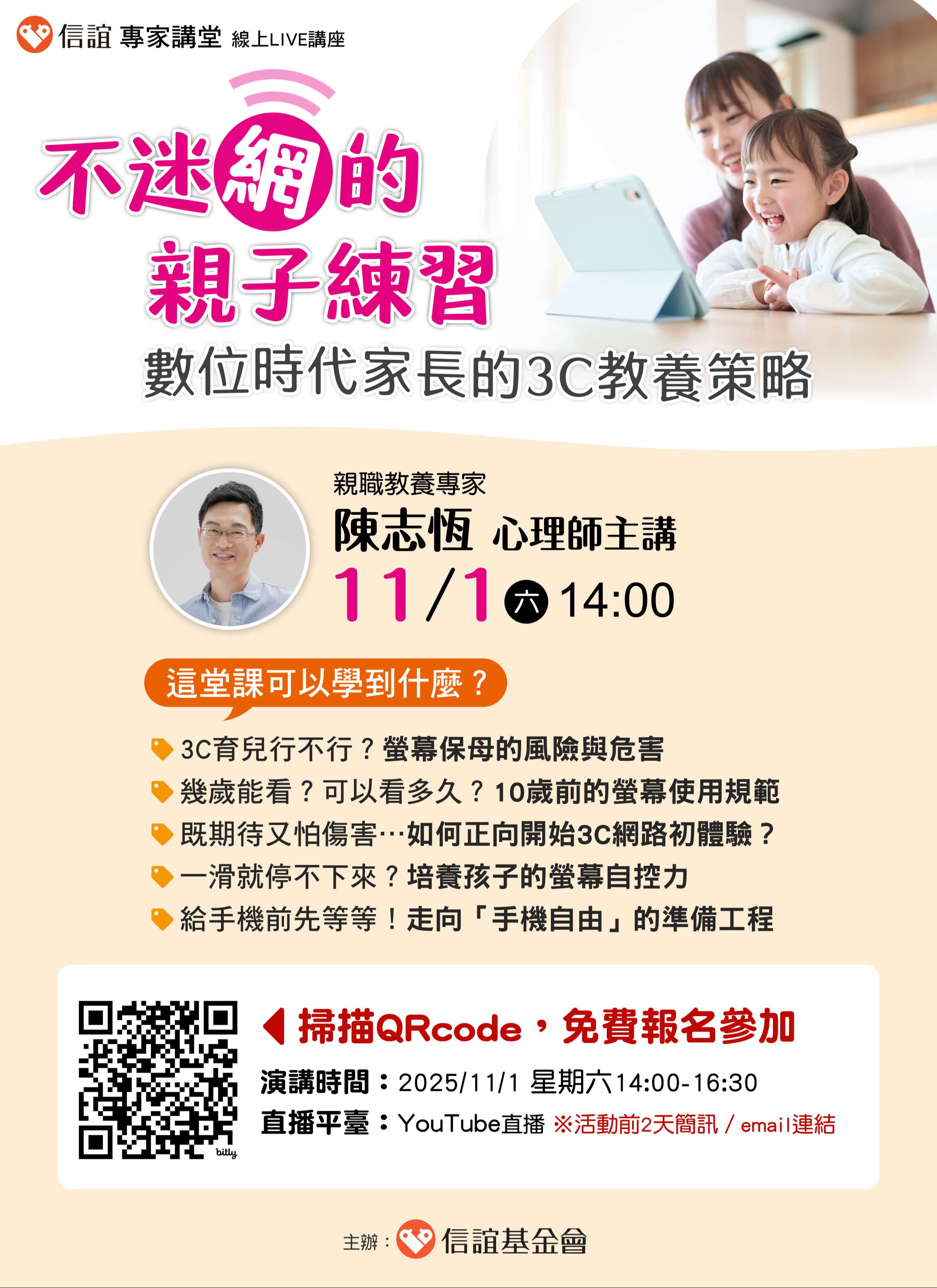 舉辦【不給手機就暴走?現代家長必學的3C教養策略】線上親職講座,歡迎家長報名參加。