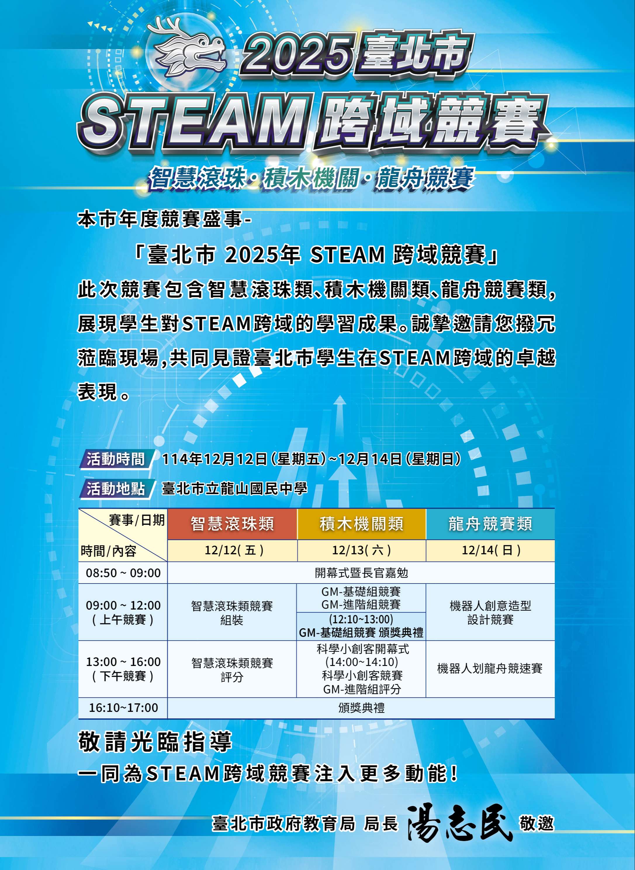 一、本校將於114年12月12日(星期五)至12月14日(星期日)辦理 「臺北市2025年STEAM跨域競賽」暨頒獎典禮。