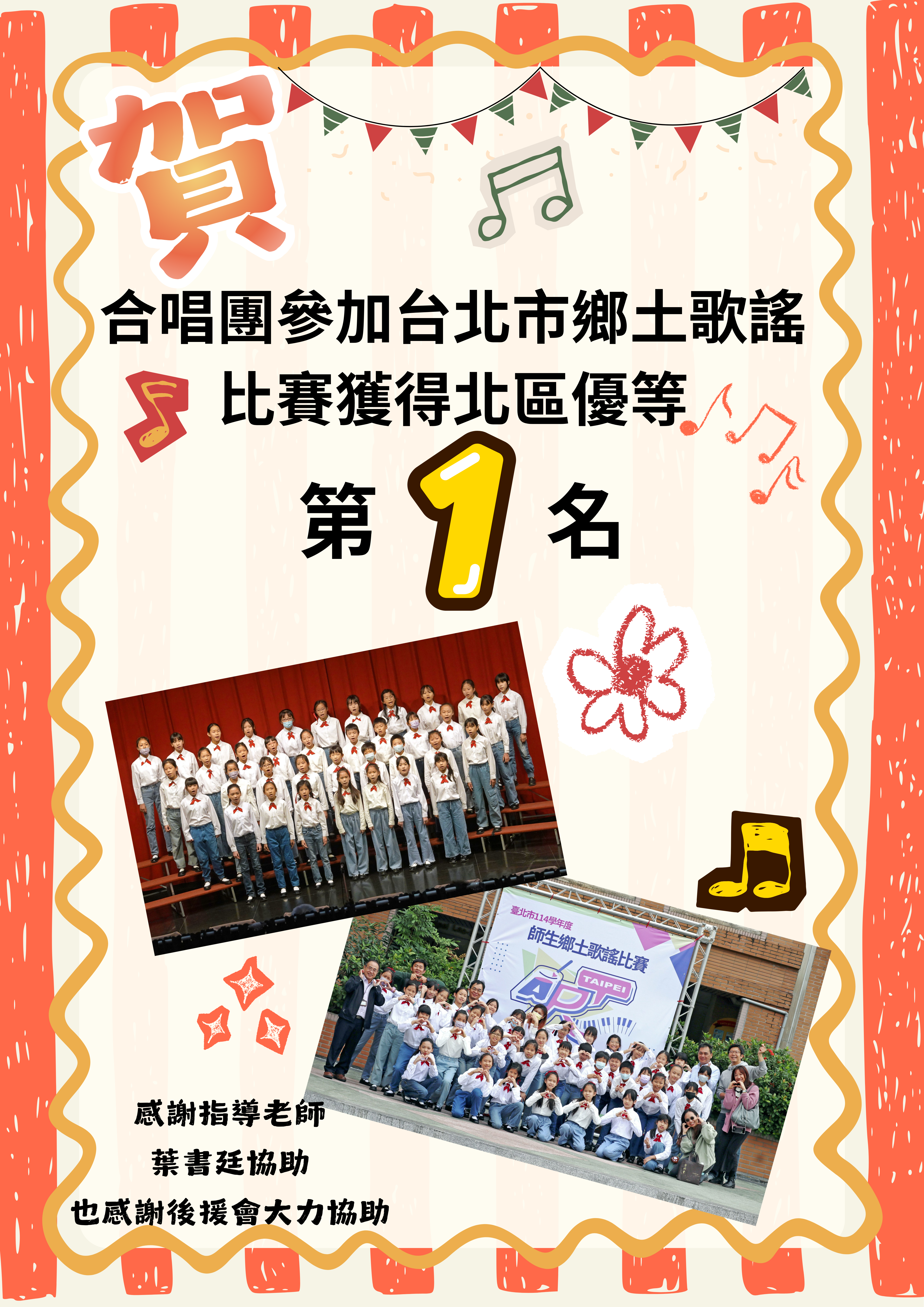 賀! 合唱團參加台北市鄉土歌謠比賽獲得北區優等第一名。