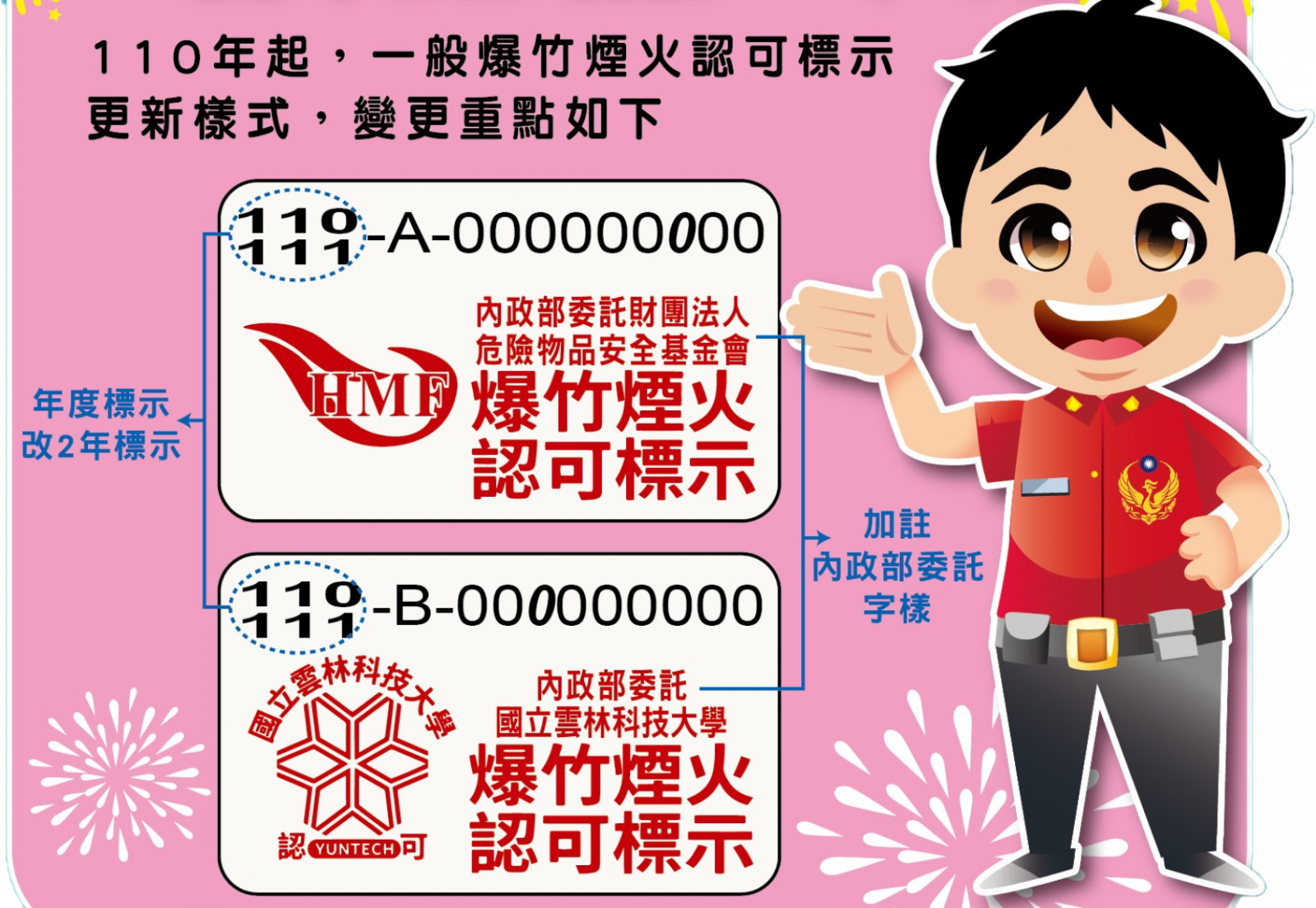 選購爆竹煙火請辨識貼有「認可標示」的合法產品。