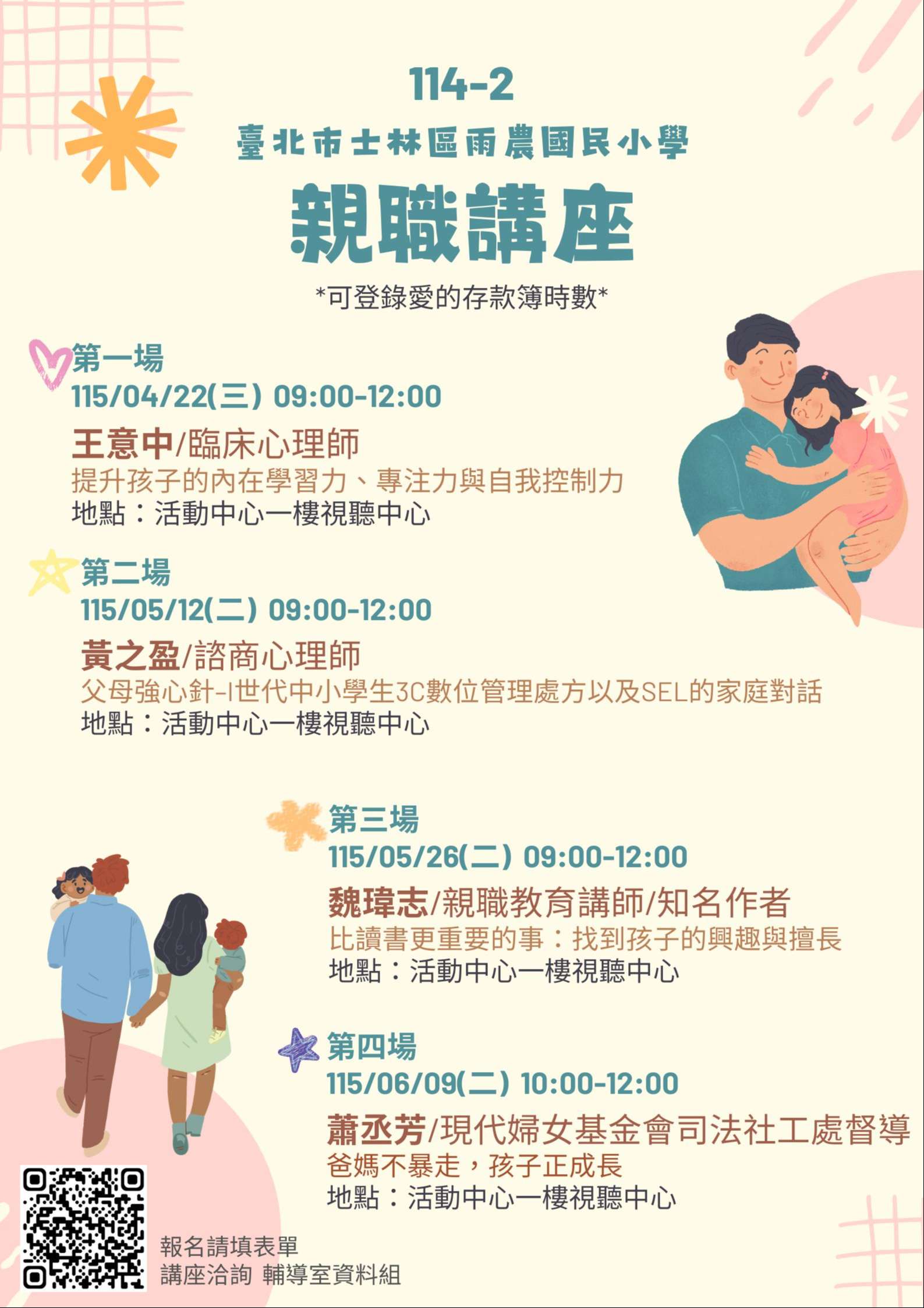 二、四場講座均核發愛的存款簿時數,活動報名連結:ht t ps: / / f or ms. gl e/ WumW89QZbUt 8TMzu7