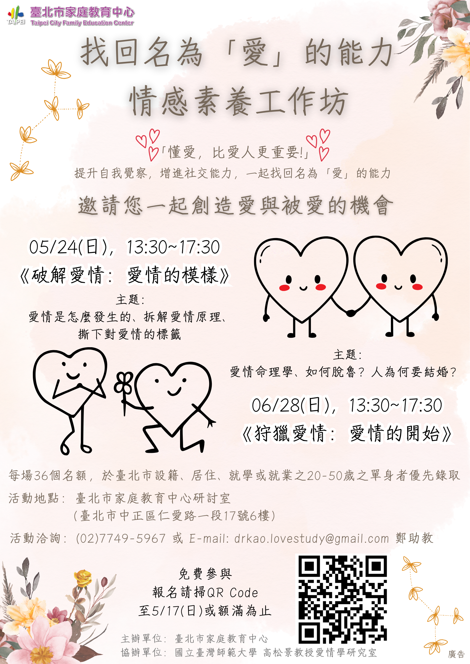 三、請鼓勵所屬單身同仁踴躍參與,並惠予協助於所屬網站宣 傳,文稿內容如下:「臺北市家庭教育中心115年度『找回 名為「愛」的能力—情感素養工作坊』,於5月24日及6月 28日(星期日)13時30分至17時30分假臺北市家庭教育中 心舉辦,活動名額為36人,歡迎年齡20歲以上至50歲之單身者踴躍報名參加(於本市設籍、居住、就學或就業者為 優先錄取),活動全程免費參與,詳細內容可於中心網站 (https://family.gov.taipei)課程與活動瀏覽及下載, 相關報名問題請寄信E–mail至drkao.lovestudy@gmail. com詢問」。